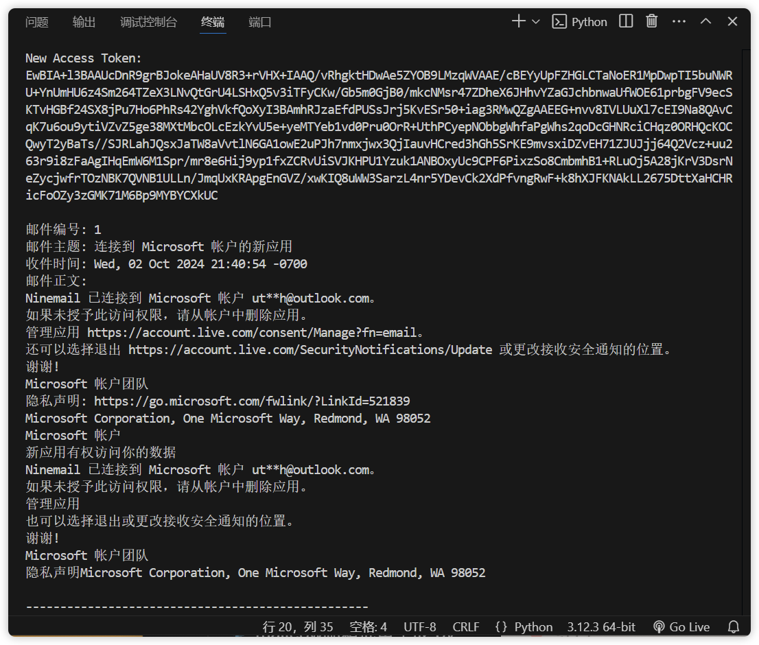 py文件demo下载地址:wwzk.lanzouo.com/i9QEN2joztqb密码:1234,下载完成后把文件名oauth2_imap_demo.py.exe后面的.exe后缀去掉,即重命名为:oauth2_imap_demo.py即可。下面是输出结果: